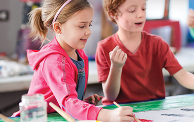 Boy and girl play with paints in classroom